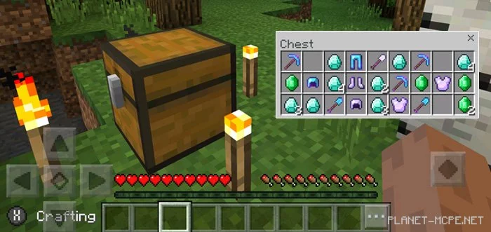 Бонусные сундуки — это новая функция версии 1.2 Minecraft. Данная функция может быть включена для миров Minecraft PE, и перед стартом игры в новом мире Вы получите некоторые предметы. По умолчанию в перечень этих предметов входят деревянные инструменты, продукты питания и другие предметы. Но, благодаря моду «OP Bonus Chest» для Minecraft Pocket Edition данные предметы будут заменены на алмазные инструменты, изумруды и другие ценные вещи.