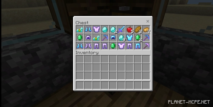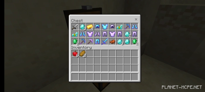 Мод «OP Chest (Сундук)» делает так, что все сундуки в Minecraft Bedrock наполняются драгоценными материалами. Это просто мод, поэтому в меню нет никаких дополнительных настроек или кнопок активации. Автор очень качественно проработал техническую часть мода, поэтому никаких лагов и вылетаний нет.