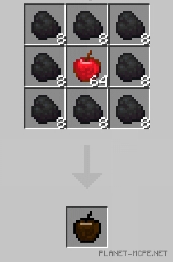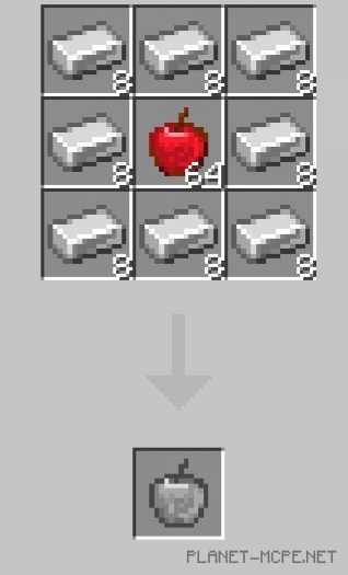 Крафтится эти яблоки таким же способом, что и классическое золотое яблоко Майнкрафт: одно яблоко в центре и вокруг него восемь тех руд, каким Вы хотите сделать яблоко. Важно: нужно использовать не блок, а руду.