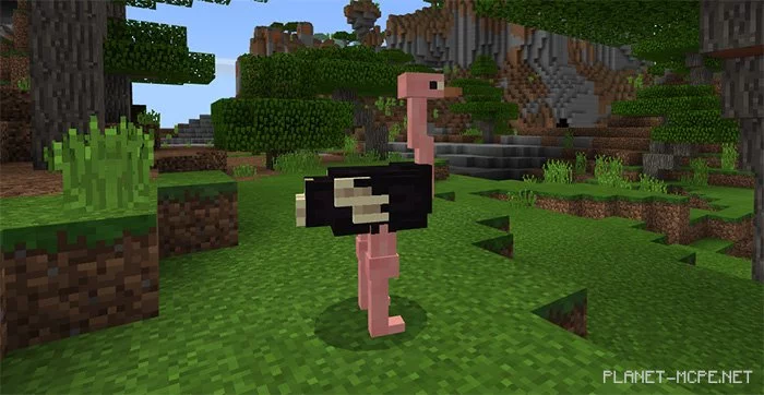 Мод «Ostrich (Страус)» реализует в Minecraft Bedrock страуса. Страус — это огромная нелетающая птица, которая после установки мода заменит курицу. Вы сможете ездить на нём верхом, но не сможете контролировать. Модель страуса очень похожа на ту, которая была показана во время Minecon Earth 2018. Надеемся, что эта птица будет представлена в одном из следующих официальных обновлений Майнкрафт в будущем.