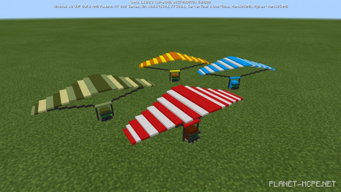 В общем, это мод, который добавляет парашют в игру Minecraft Bedrock. Для этого внутриигровой предмет: «Череп моба» был заменён четырьмя разными цветами парашютов: синий, красный, оранжевый и зёленый.