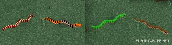 В мире Minecraft PE будет существовать несколько различных видом змей (яйцо для спавна id — 2847). Некоторые виды змей ядовитые, поэтому будьте осторожными.