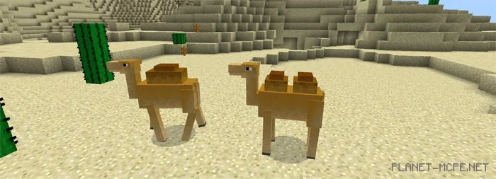 Верблюды (яйцо для спавна id — 2818) не являются враждебными животными. Как правило, верблюды живут в пустыне, где они путешествуют от одного источника воды к другому.