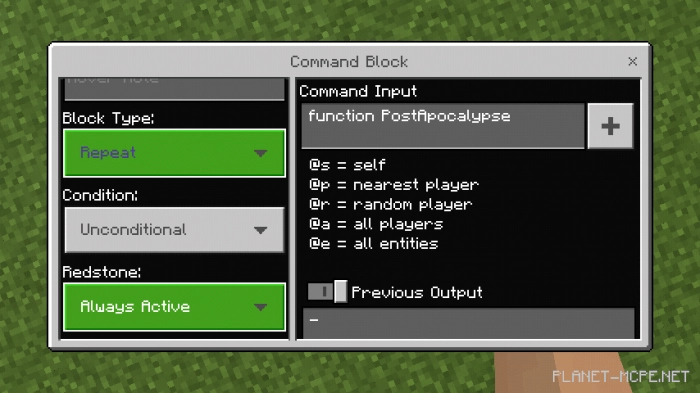 Перед использованием мода создайте командный блок, введя в чате «/give @p command_block». Затем откройте командный блок и введите «function PostApocalypse». И, как обычно поставьте, на повтор и режим «всегда активный».
