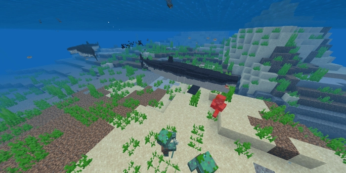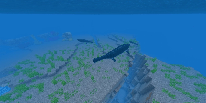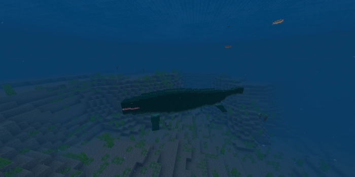 Мозозавр. Вымершее существо, которое сравнивают с обычными крокодилами нашего времени. Мозозавры спаунятся во всех биомах океана, кроме замерзшего и теплого. Максимальная длина составляет 18 блоков, высота — 2 блока (тоже без учета плавников). Нападает на игроков и морских обитателей, после смерти оставляет чешую. Здоровье — 50 сердец.
