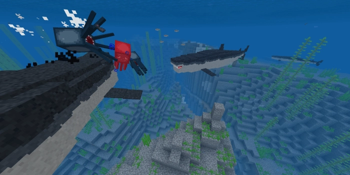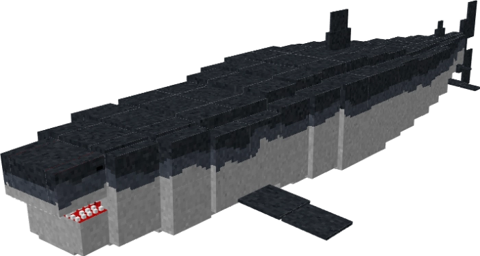 Мегалодон. Один из видов существовавших раннее акул, в сопоставление которому зачастую ставят нынешних белых акул. В Майнкрафте оно появляется во всех биомах океана, кроме замерзшего и теплого. Максимальные размеры мегалодона составляют 18 блоков в длину и 2 в высоту (без учета плавников и хвоста). Он атакует как морских обитателей, так и игроков. После смерти сбрасывает зуб на память. Здоровье — 50 сердец.
