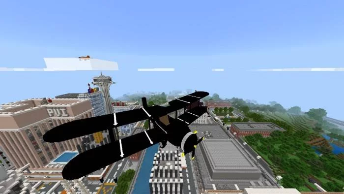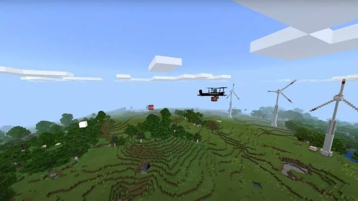 Модель и анимация для летательного аппарата из мода Разрушительный самолет (Havoc Biplane) сделана вполне себе добротно! В Майнкрафте реализован наклон во время полета, а также присутствует верчение пропеллера.