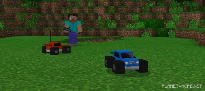 Радиоуправляемые автомобили продаются продавцами в деревнях. Есть два разных RC-автомобиля, каждый из которых реагирует на свой контроллер. (И это значит, что доступен мультиплеер режим MCPE). Перед использованием автомобиля RC Вам необходимо зарядить его. Для этого понадобится батарея (заменяют золотые слитки).
