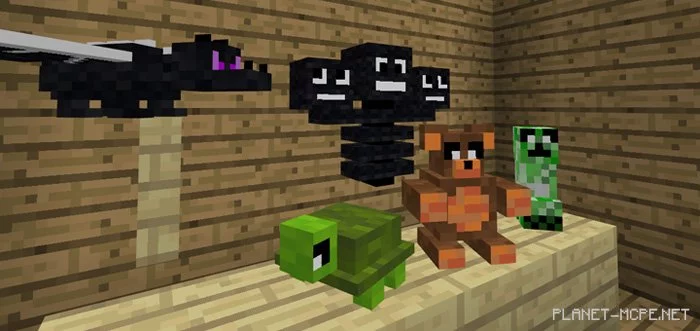 Мод «SG Plushies (Плюшевые игрушки)» заменяет некоторые черепа и головы в Minecraft PE различными видами плюшевых предметов. В настоящее время существует пять различных плюшевых игрушек, но в будущем их можно будет добавить больше. Всех их Вы, на самом деле, можете получить на SkyGames Fan Realms. Они предназначены для использования в качестве украшений, но Вы также можете носить их как шлемы в MCPE.