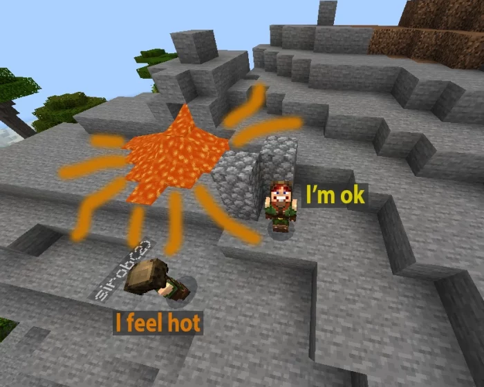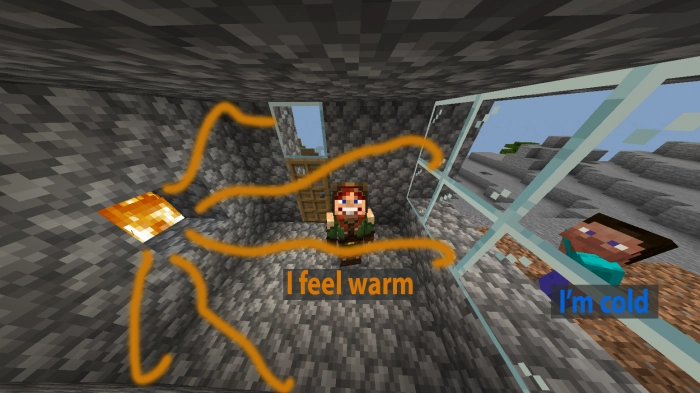 На состояние ГГ с модом Температура игрока (Player Temperature) будет влиять в Minecraft Bedrock практически все – начиная от ныряния в воду, и заканчивая светом факелов. На примере этих скриншотов из MCBE видно, как реализована эта механика в модификации.