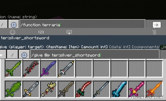 Для получения командного блока в Майнкрафте введите «/ fuction terraria». Также Вы можете ввести «@p ter: [название меча]», чтобы получить меч.