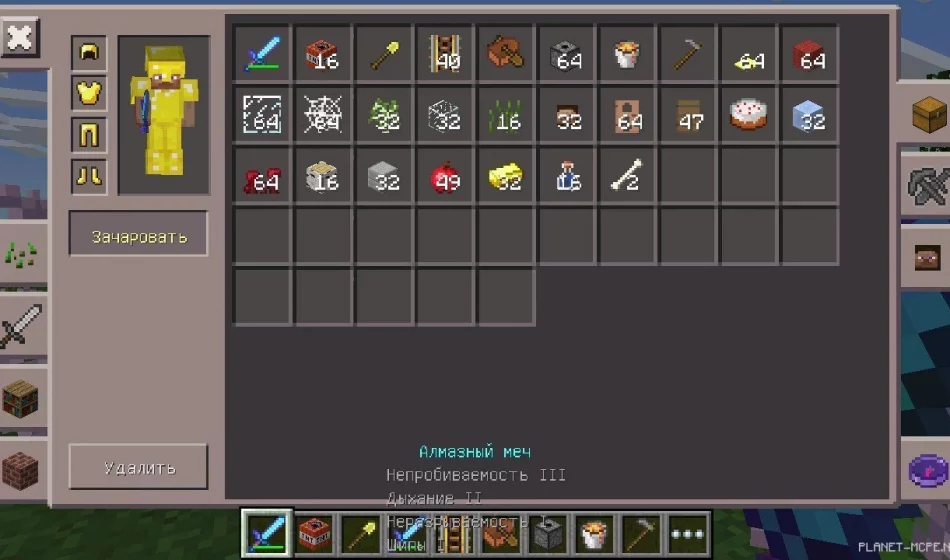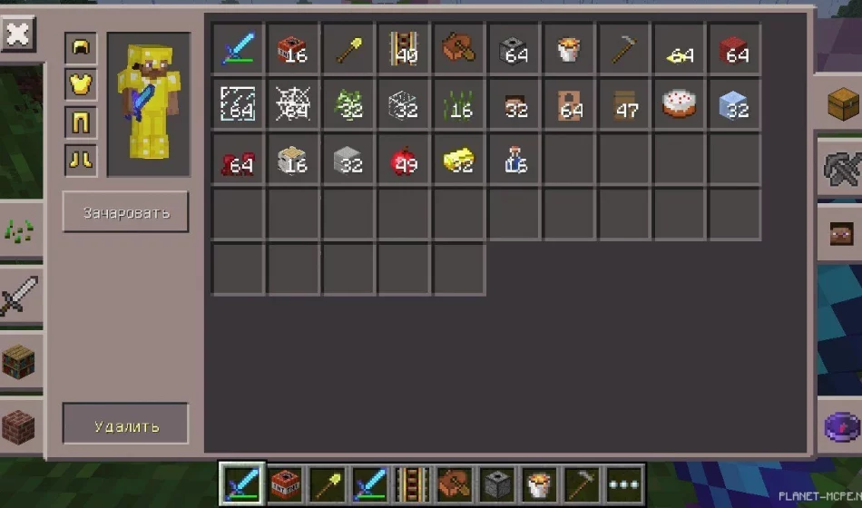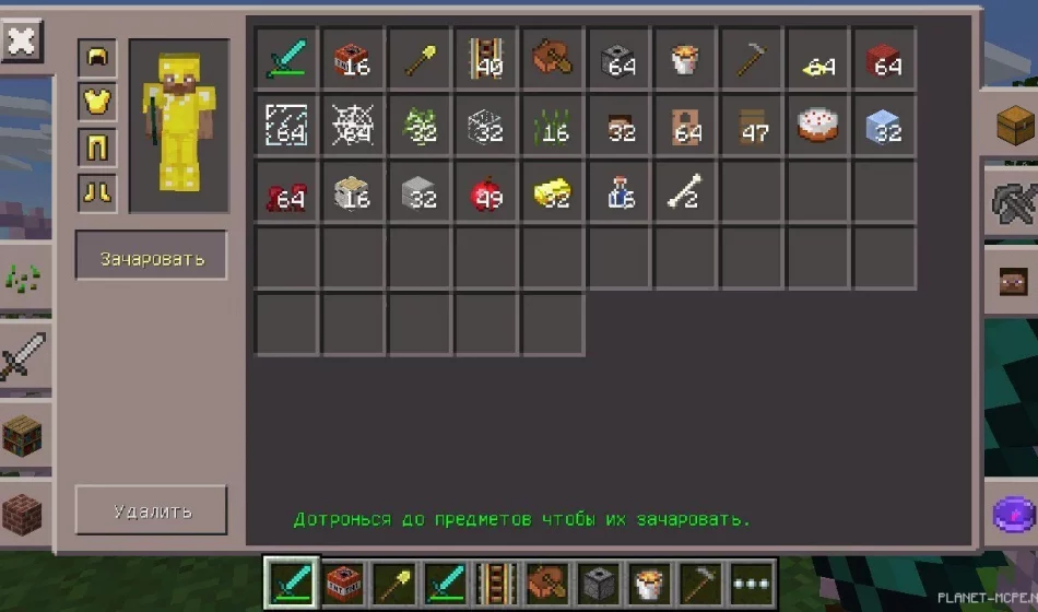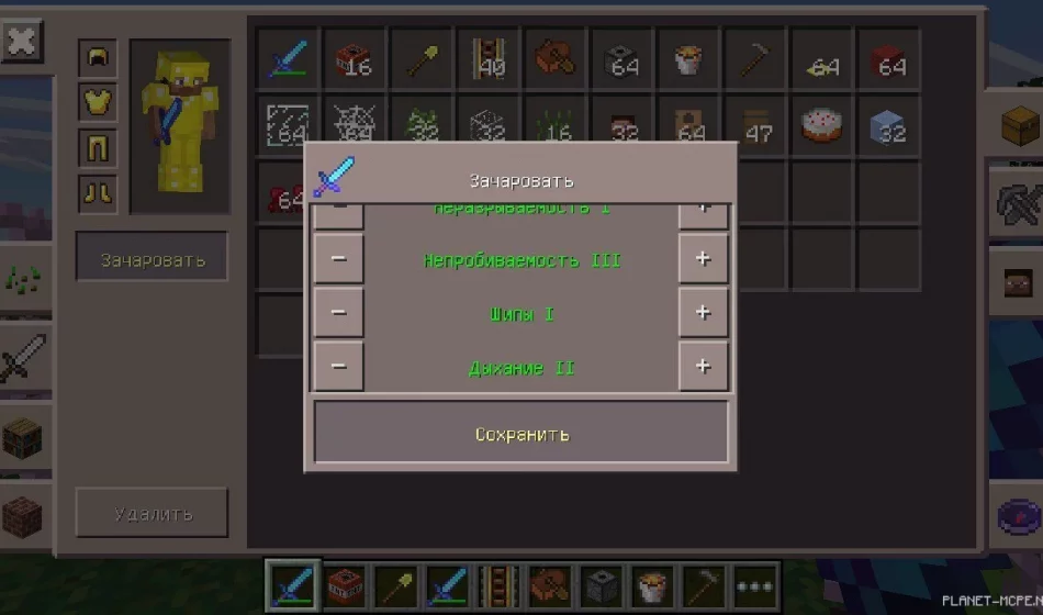 Выбери «Зачаровать», а затем инструмент. Затем укажи параметры нужных чар и кликай «Сохранить».