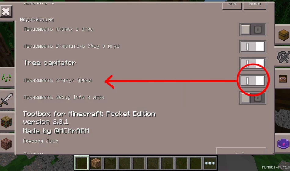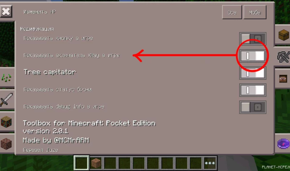 Как скачать мод Toolbox для Майнкрафта на телефон ты уже понял, а теперь поговорим о том, как он работает. Найди раздел «Modifications» и включи поддержку рентгена.