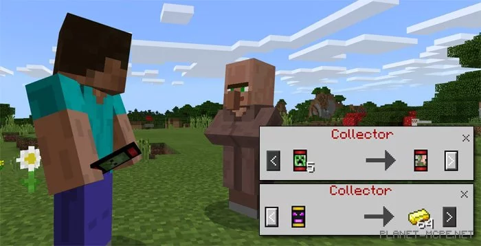 Коллекционер — новый тип деревенских жителей MCPE, который торгует карточками. Некоторые из Ваших карточек можно обменять на ценные предметы, такие как золотые слитки.