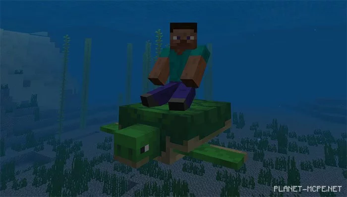 «Turtle Plus (Черепаха +)» — это мод, который добавит ещё несколько применений для нового моба в Майнкрафт Бедрок — черепахи, которая была добавлена в Водном Обновлении. Теперь Вы сможете приручить черепаху и взять её с собой в приключения Minecraft. Он будет следовать за Вами как Ваш верный спутник и даже позволит Вам кататься на нём, как на суше, так и на воде.