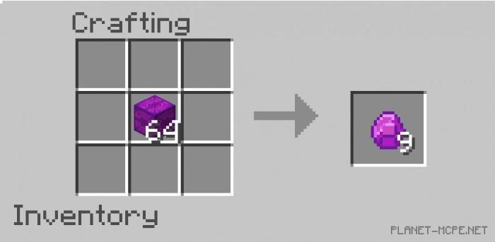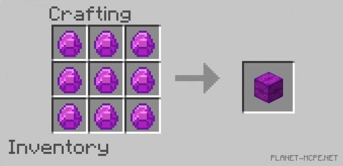 Вы можете скрафтить блок самостоятельно или получить его из инвентаря. Так как этот блок имеет достаточно необычный внешний вид, Вы можете использовать его в создании сборок (как комната на превью). Создается новый блок с помощью нового алмаза. Также это работает в обратном направлении: 64 блока могут быть превращены в 9 алмазов.