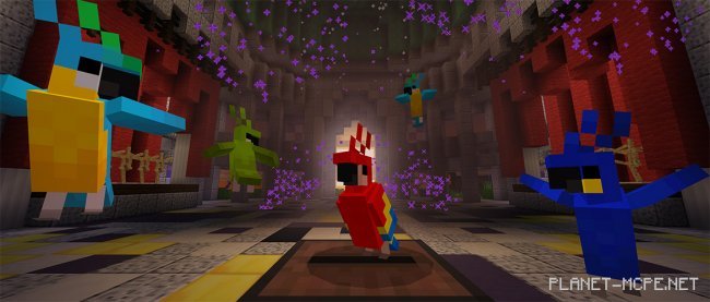 «Празднование всей группы пурпурных попугаев и дворца!», — пишет команда Minecraft в описании. «Освойте механизм фейерверков, доспехов, музыкальных автоматов и баннеров. Отправьтесь на остров джунглей в мире МКПЕ, чтобы найти массивный храм попугаев. Отчасти обучение, отчасти приключение, эта карта сделает Вам танец попугаев». Что это значит? Это угроза?