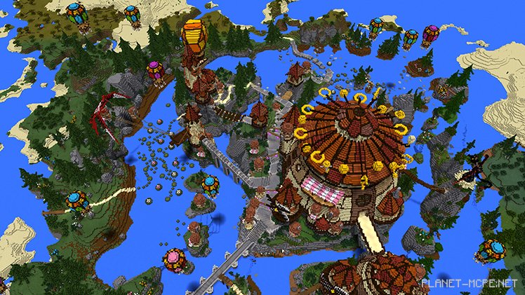 Взгляните на этот причудливый поселок в мире Minecraft Pocket Edition, каждое выпуклое здание которого, аккуратно расположилось на короткой скале, усеянной красивой лагуной. Пройдите через воздух, над болотами, под мостами или найдите просвет, чтобы посмотреть на воздушные шары, летящие высоко в небе.