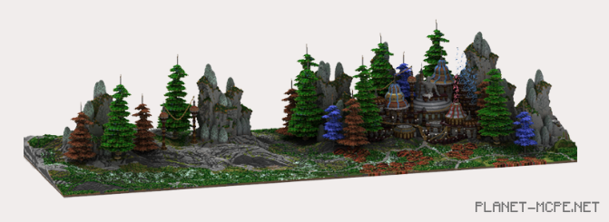 На маленькой территории, где расположилась линия, которая показывает очертания земли в МКПЕ, вы сможете увидеть изображенный ряд сосен, скалистые скалы, которые возвышаются позади, кластер зданий, который расположен в центре. Но каждое является необычным. Деревья бросают вызов своему вечнозеленому статусу, ведь они появляются в красных и синих тонах! Скалы являются странными, они обладают кристаллическими выступами, будто бы сталагмиты (видимо, вдохновленные во время просмотра BFC). В то время, здания богато украшаются цилиндрическими предметами, а также герметизируются крыши, это удивительно, но факт, связано с овсянкой, такой дизайн является уникальным и специально от Donut(Пончика) в Minecraft Pocket Edition.