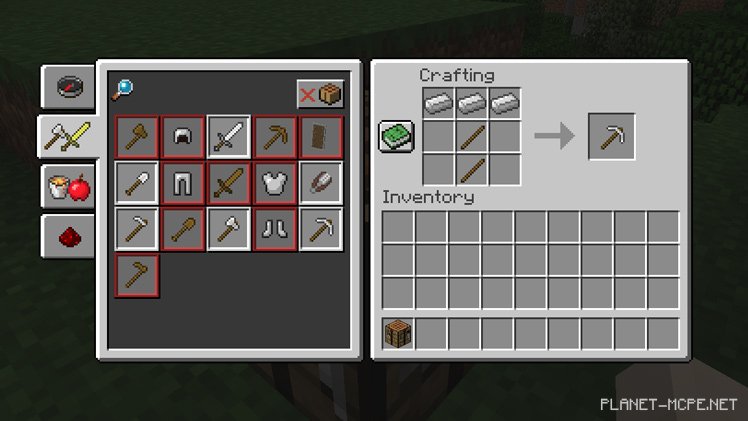 И так, первым в очереди будет самый легендарный предмет Minecraft Pocket Edition — кирка! Это самая популярная вещь во всей игре, ведь благодаря ей можно добывать камень, руды, а также разрушать такие объекты, как печи, наковальни и железные прутья. Зачастую, это первый инструмент, который делают в игре, из двух палочек и трех кусков дерева. Не притворяйтесь, что этот рецепт все еще остался в вашей голове.