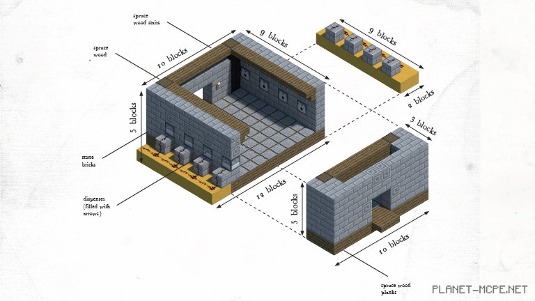 Защитная постройка — одна из самых простых ловушек, которую вы можете добавить в свой замок, с очень простой схемой из красного камня, которая вызывается большим набором нажимных пластин. Тем не менее, она также может быть одной из самых опасных, поскольку она охватывает такую ​​большую площадь, вследствие этого будет сложно убежать от данной ловушке Майнкрафт Покет Эдишн.