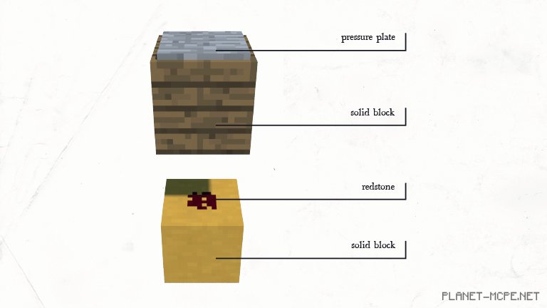 Механизм состоит из двух блоков и красный камень соединяется между ними, также имеется факел из красного камня спереди и сзади каждого блока. Когда нажимная пластина нажимается, сигнал начинает проходить через редстоун решетку и многократно включает и выключает механизм, подавая прерывистые сигналы через ретранслятор с каждой стороны ловушки в направлении верхней секции в Minecraft Pocket Edition!