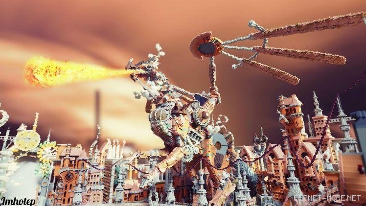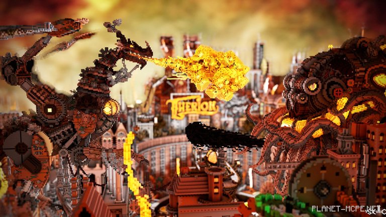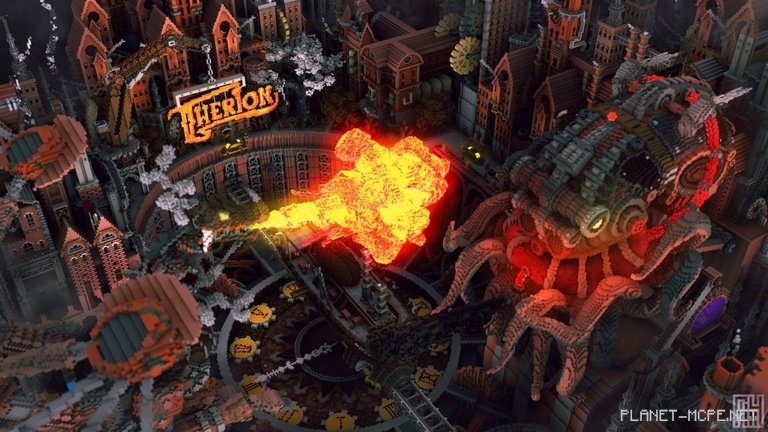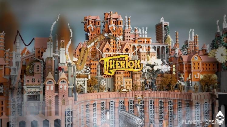 Корабль движется по поднятым рельсам через грань гигантских часов, попавших в перекрёстный огонь двух огромных механических существ. Вертикальный городской пейзаж создает сюрреалистическую сцену; высокие промышленные здания с гигантскими выступающими шестернями, дымоходы, извергающие дым, толстые трубы, впадающие в яму у подножья города. На грузоподъёмном кране изображён знак с названием города: Therion, что на греческом значит «зверь». Существует даже сопроводительное стихотворение к этому действию в Minecraft Pocket Edition, в котором намекает на более крупную историю, в которую входит этот снимок, рассказ о путешественниках и порталах в других измерениях.