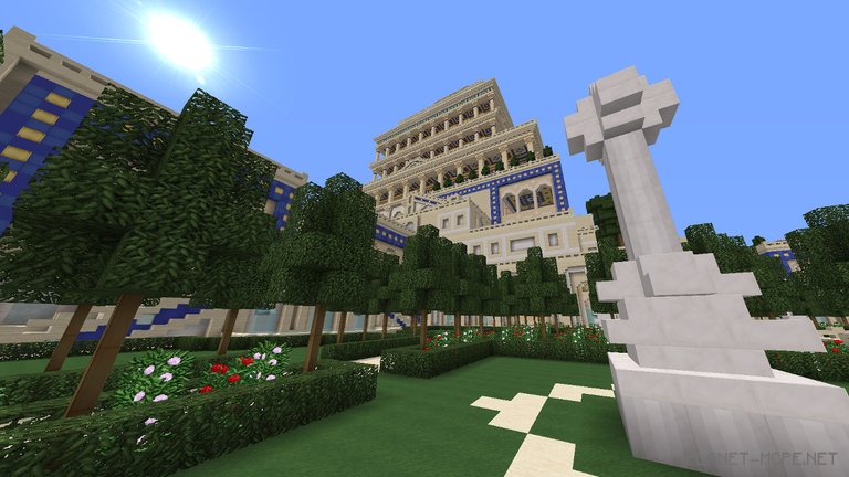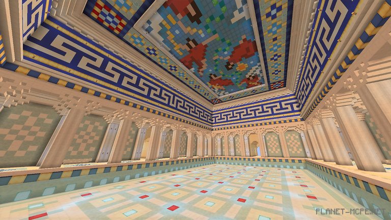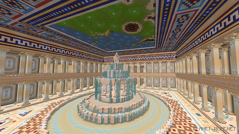 Небесные сады были построены для конкурса небоскребов в Minecraft. Это великолепное, огромное здание с классической греческой архитектурой. Интерьер проработан до каждой, самой мелкой детали, а количество колон, как внутри, так и снаружи, переваливает за сотню! Это очень много!