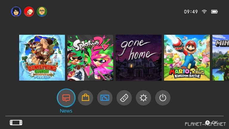 [1/4] — Так выглядит главное меню. Выберите маленький красный значок в левом нижнем углу, чтобы открыть новости. Вот Вам небольшое испытание: попробуйте не играть в замечательный Splatoon 2 в течении нескольких часов.