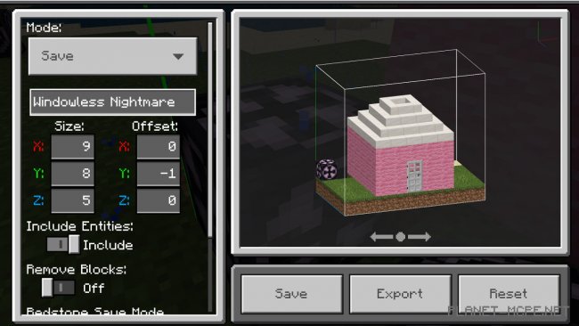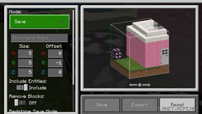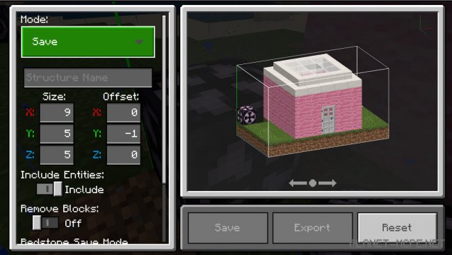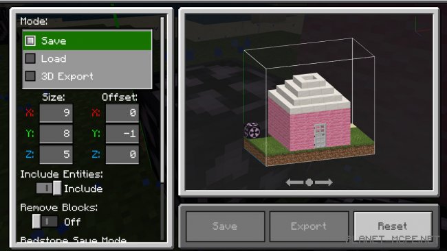 Если Вам нужно скопировать только сам объект, не включая туда мобом и прочих существ, нужно выключить «Include Entities (Включить объекты)». В обратном направлении это работает точно также. Вы можете включить эту функцию и клонировать Странствующих Торговцев, свиней и других полезных, прекрасных мобов в свое удовольствие! Почему бы не наклеить табличку с надписью «Долли» на овцу и не повторить научные опыты в Minecraft Bedrock?В верхнем левом углу меню есть три режима на выбор: «Save (сохранить)», «Load (загрузить)», «3D Export (экспортировать в 3D)». Давайте сейчас выберем «Save (сохранить)».