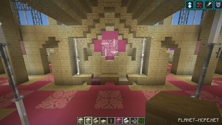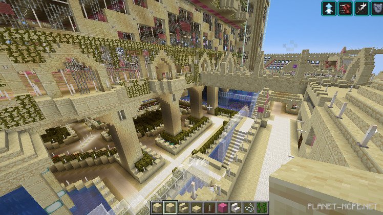 Строительство началось в пустынном биоме, что означало наличие большого количества песчаника, точечного кварца и бетона. Также по всему периметру замка расположено множество растений. Paige сделала живые изгороди для того, чтобы внутреннее пространство было красиво благоустроенно, плюс ко всему внутри есть водопад. Здорово, правда?