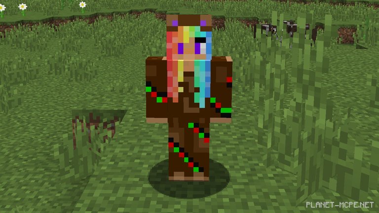 Замечательный, приятный на ощупь, красно-зеленый шарф. Мне он напоминает о том, как сильно я замерз, в особенности моя шея, но не об этом сейчас. Шарф, конечно, очаровательный, но ведь это не та вещь, которая притянула Ваше внимание? Все дело в намотанной на руку цветной гирлянде. Именно она придает этому скину необычайность и выразительность. Выглядит потрясающе, но только в Майнкрафт, потому что в реальной жизни я настоятельно не рекомендую такое повторять, это может быть опасно для Вас, в исключение того, если Вы рождественская елка (если мы угадали и Вы на самом деле являетесь елочкой, то, пожалуйста, прекратите мне писать с просьбами убрать из игры все топоры. Могу Вас разочаровать — этого никогда не случится!)