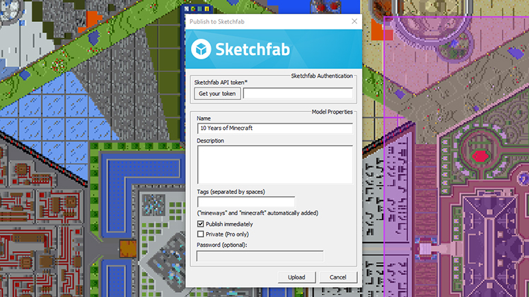 После завершения Вы можете опубликовать свою работу на SketchFab. Нажмите «Get your token» для получения ключа доступа. У Вас откроется сайт, где нужно будет вставить этот ключ и нажать кнопку загрузки.