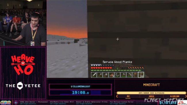 Illumina: Ах, точно. В общем, Вы можете настроить свой аватар в игре так, чтобы я носил плащ Minecon 2015, который получил, когда меня пригласили принять участие в скоростном забеге в Diversity 2 и в Set Seed Glitchless.[Любимый спидран Illumina на Играх Быстрого Прохождения прямо сейчас. Мир Minecraft наполнен ужасами и генерированием случайностей, которые могут испортить забег, но он делает такую великолепную работу!]