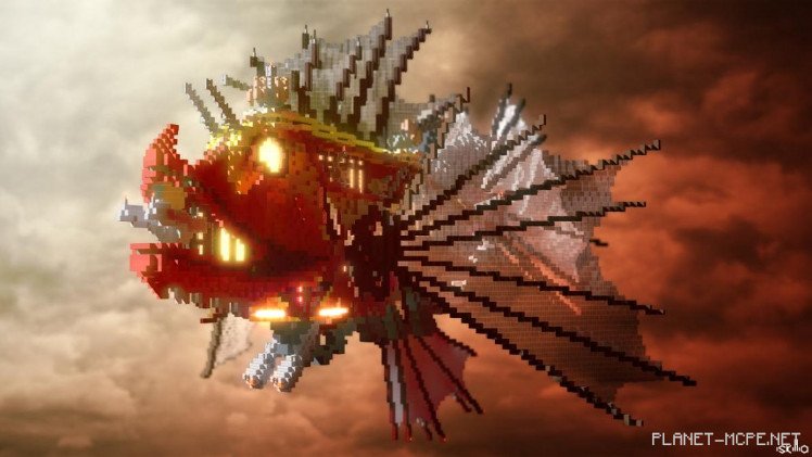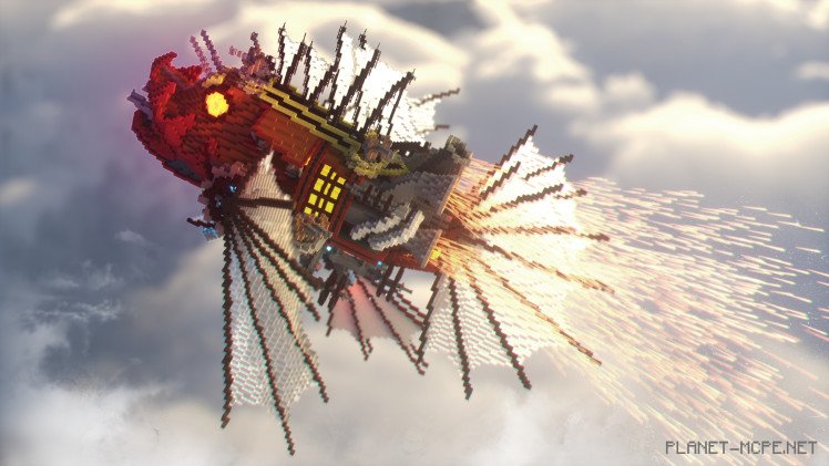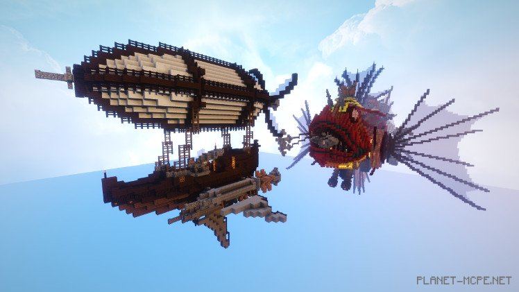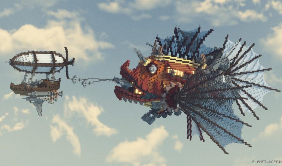 «Эта сборка представляет собой погоню двух дирижаблей», — объясняет Meafcraft. «Старые технологии когда-то считались новыми и превосходными, но прогресс не стоит на месте, и со временем они стали устаревшими, примитивными и в конечном итоге превратились всего лишь в историю.» Меньший дирижабль — из викторианской эпохи, не используется в современное время. Изготовлен он из дерева и ткани, а вот The Bounty — более новый, современный и мощный корабль Minecraft, созданный с использованием инновационных технологий и основанный, к сожалению, на настоящей рыбе.