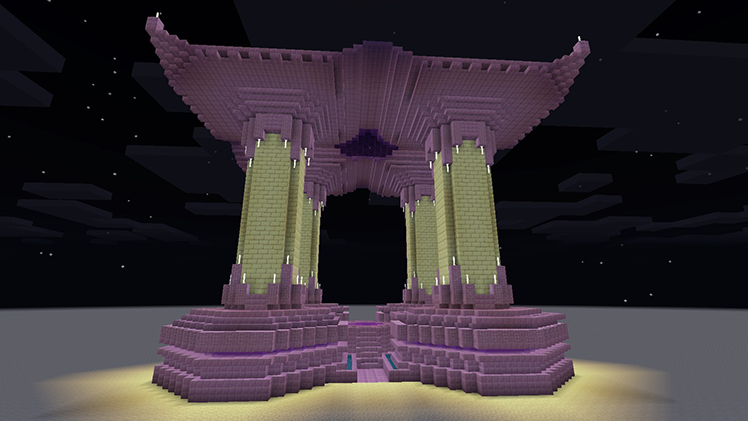 Для создания максимального контраста подойдет золото. Правда говоря, сборка из пурпурных и золотых блоков будет чрезмерно дорогой, поэтому в качестве альтернативы можно взять песчаник. Как, в принципе, и сделали строители Minecraft Bedrock: