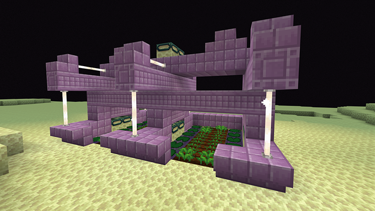 Фиолетовый цвет довольно дерзкий выбор для уличных сооружений. В реальном мире редко можно найти здание, содержащее фиолетовые элементы. Что касается полной покраски, так это вообще что-то из ряда вон выходящее. Игроки Minecraft не боятся экспериментировать с необычными цветами и материалами, но здесь возникает иная проблема. Чтобы добыть пурпурный блок, придется идти в Край и искать его там, что довольно сложно и бессмысленно в некоторых случаях.