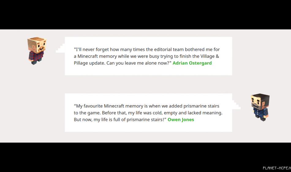«Мое любимое воспоминание Майнкрафта — когда я добавил призмариновые лестницы в игру. До этого моя жизнь была холодной, пустой и лишенной смысла. Зато теперь она наполнена призмариновыми лестницами!» — Овен Джонс.