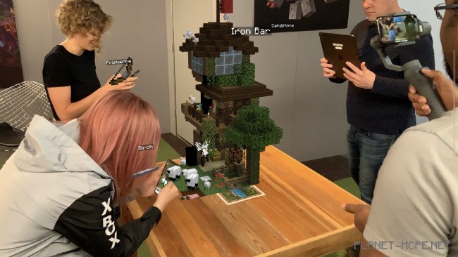 Но потом ко мне подошел человек и дал телефон, на котором был запущен Minecraft Bedrock. Я взял его, направил на этот стол и просто застыл в изумлении. На столе располагалась скромная, но просто волшебная сборка! Телефон давал мне команды, и я начал ходить вокруг стола, рассматривая каждую деталь сооружения. Это было что-то фантастическое!И это не просто восхитительная проекция, там нет такого понятия как «руками не трогать». Игра полностью интерактивна, все, что я могу делать в Майнкрафте, я могу делать там: открывать двери,  активировать прижимные пластины и, как же без этого, строить. Правда, последний пункт мне дался не так просто, пришлось немного приспособиться. А для тех, кто привык играть в версию Minecraft Pocket Edition, проблемы вообще не возникнут. Пара попыток, и Вы будете строить, как настоящий профессионал! Можно считать, что телефонная версия игры — учебник для новой.В игре дополненной реальности, казалось бы, должно быть множество отличий от обычной, но нет, здесь все практически идентично. Когда я приближался к мобам, они меня словно видели и начинали вести себя по другому: свиньи начинали внимательно рассматривать меня, когда я приближался к ним, попугаи недовольно махали крыльями, а сельские жители с ненавистью смотрели мне вслед, когда я спокойно открывал дверь и заходил в их дома, пф, как будто они являются владельцами этих домов. В следующий раз, когда будешь недоволен моему приходу, посмотри договор об аренде, житель!После того, как мы насладились сборкой, было принято решение поместить ее на пол, чтобы увидеть дом в полном масштабе. Мы сняли поверхность стола и поместили ее в дальний угол комнаты. Затем я вновь взял в руки телефон и направил на дом. Это было очень неожиданно! Я только что видел небольшой домик, с легкостью умещавшийся на столе, и теперь он стал таким огромным, что я могу ходить по нему! Я захожу внутрь дома и попадаю в мир Майнкрафта! Я так сильно не радовался, даже когда встретил моего кумира на улице!