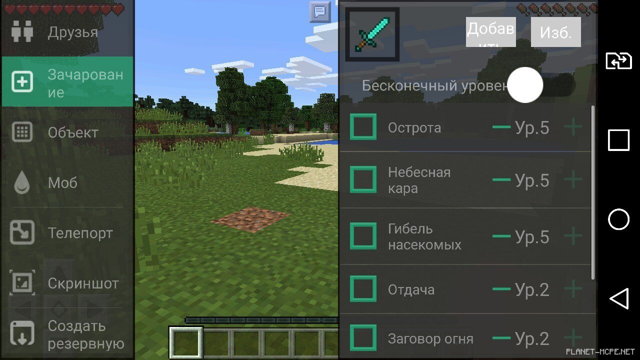 5. В игре: GUI и читы: Нажми кирку в углу — меню «Игрок» (бессмертие, полёт), «Игра» (погода, время, мини-карта), «Зачарование» (улучшай инструменты: выбери предмет, добавь эффекты).