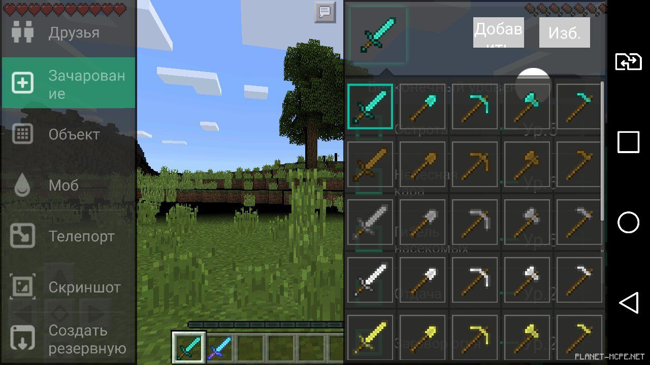 Далее не менее интересный раздел в MCPE Master — это «Зачарование». В этом меню вы можете зачаровывать инструменты. Чтобы выбрать инструмент который вы хотите зачаровать нажмите по иконке — «Меч». После чего перед вами откроется меню с иконками всех доступных элементов для зачарования.Меню Зачарование в MCPE Master