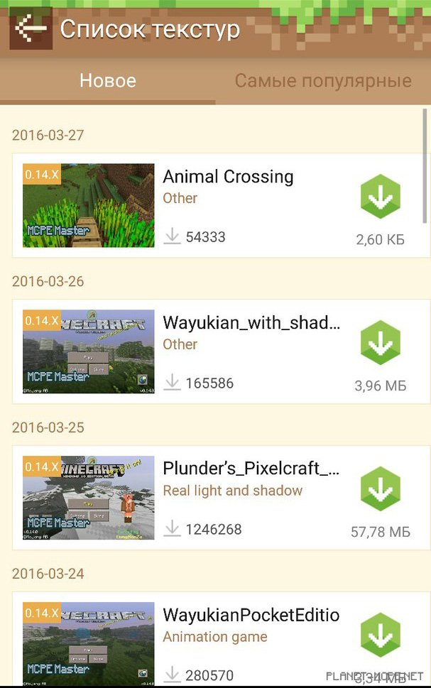 Перейдите в раздел с текстурами. Найдите понравившейся Вам текстур пакет и нажмите по иконке загрузки. Дождитесь пока текстура скачается. Когда текстур пакет скачался — напротив него появится кнопочка — «Apply to the game» — нажмите на неё, чтобы установить данный текстур пакет на игровой клиент MCPE.