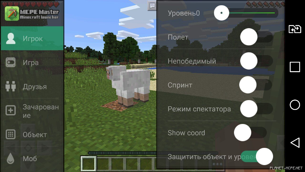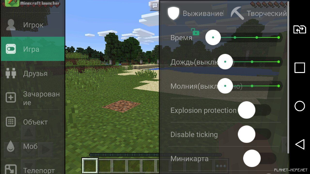 Следующее меню которое идет после «Игрок» — это «Игра». В меню «Игра» вы можете устанавливать некоторые игровые настройки: изменять погоду, устанавливать время, вынести на главный экран MCPE мини карту и другое.Меню Игра в MCPE MasterДополнительные настройки в MCPE Master