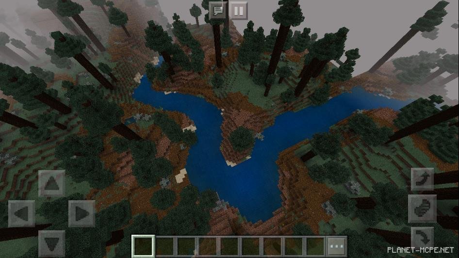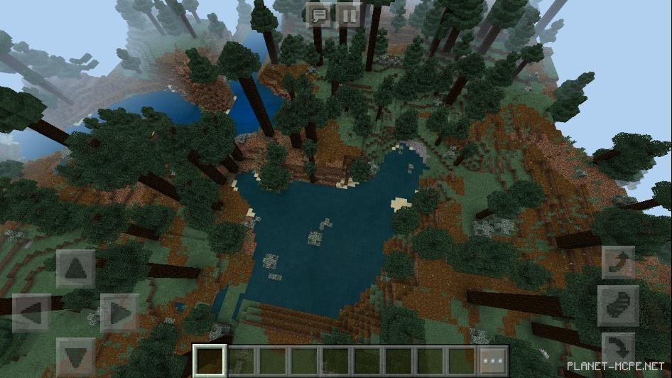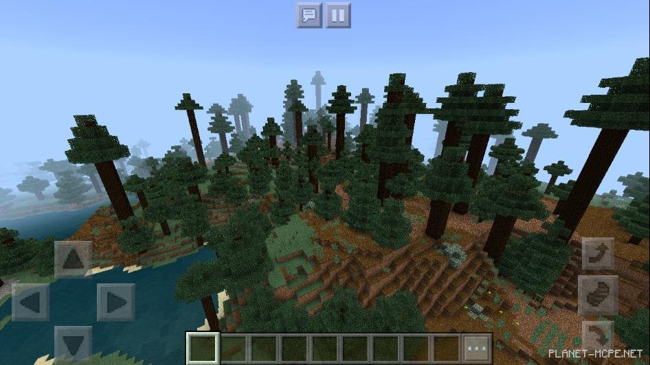 На этом сиде в Майнкрафт Бедрок есть действительно большого размера хвойный лес в котором поистине огромные деревья. Также среди этих деревьев можно встретить водоемы различных размеров.