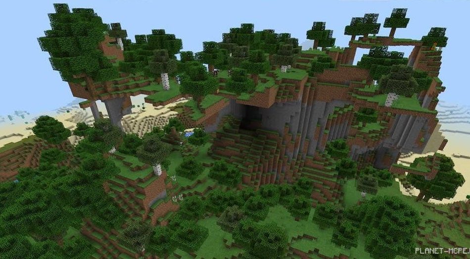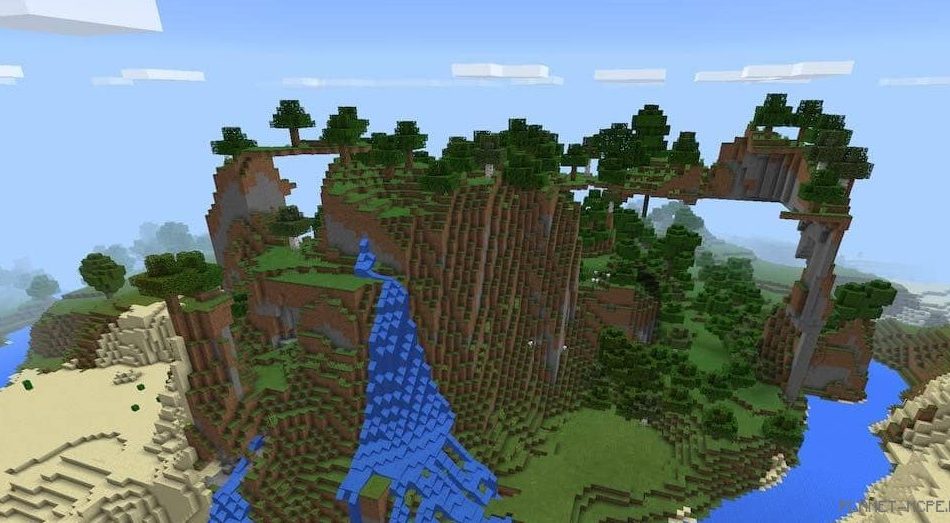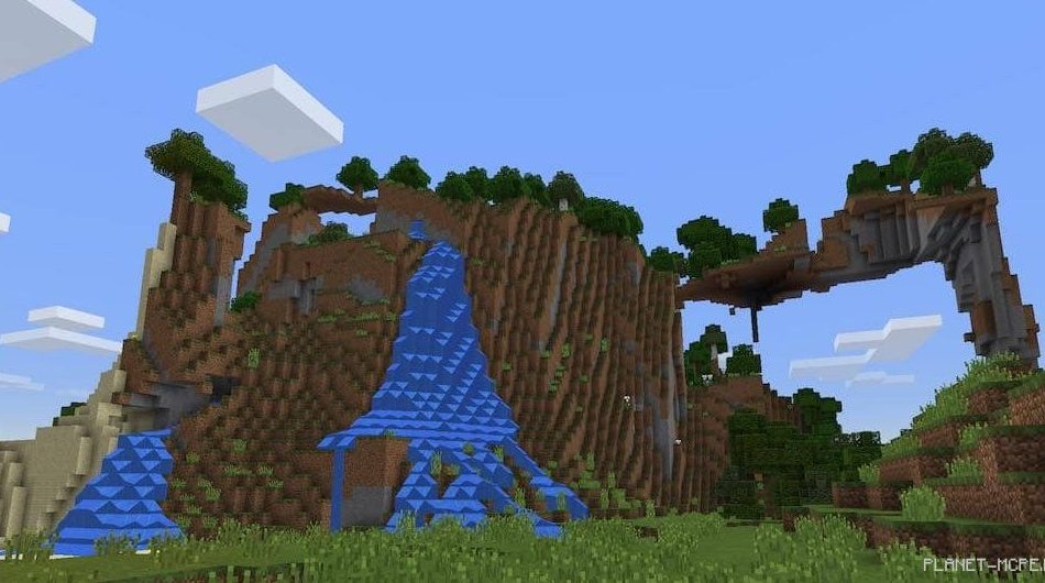 Когда Вы начнете играть с этим сидом для Minecraft Pocket Edition, то перед Вами будет массивная экстремальная гора. Наверху растут деревья, а вниз стекает водопад, которым невозможно налюбоваться. Так же есть «мостик», который соединяет два участка горы. Рядом протекает речка. Кстати, все это находится на стыке трех биомов. Мне кажется, что небольшой домик в горе здесь будет как нельзя кстати!