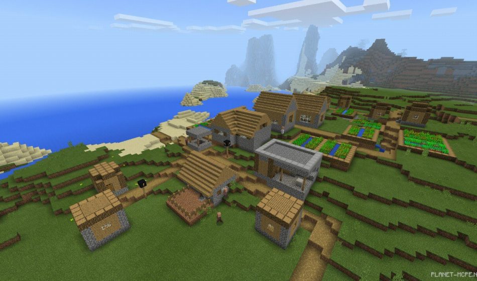 Когда Вы введете сид и появитесь в мире Minecraft Pocket Edition, то осмотревшись по сторонам заметите деревню на самом берегу океана. Конечно же, нужно сразу проверить сундук в кузнице. В нем есть элементы железной брони, саженцы и немного еды. Если не хотите жить в деревне, заберитесь на горы и постройте дом там. Вид оттуда будет шикарным.