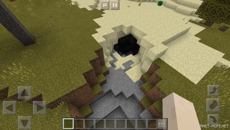 Также рядом есть песок, а там есть крутой спуск в пещеру. Будет удобно ходить в пещеру, которая расположена на той местности на площадке mcpe.