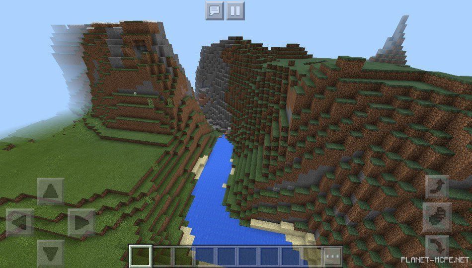 На этом сиде в Майнкрафт Покет Эдишн вы сможете увидеть множество гор, пещер, а также рядом с горами протекает река, однако она не является длинной. Она является широкой в том числе в Майнкрафт ПЕ.