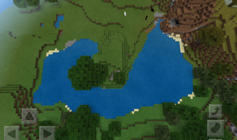 На этом сиде в Майнкрафт Покет Эдишн вы сможете увидеть большое количество водоемов, и вот один из них. Данный водоем в Майнкрафт ПЕ находится недалеко от возвышенности, рядом с которой растут деревья в МКПЕ. Также рядом, в горе, есть маленькая пещерка.