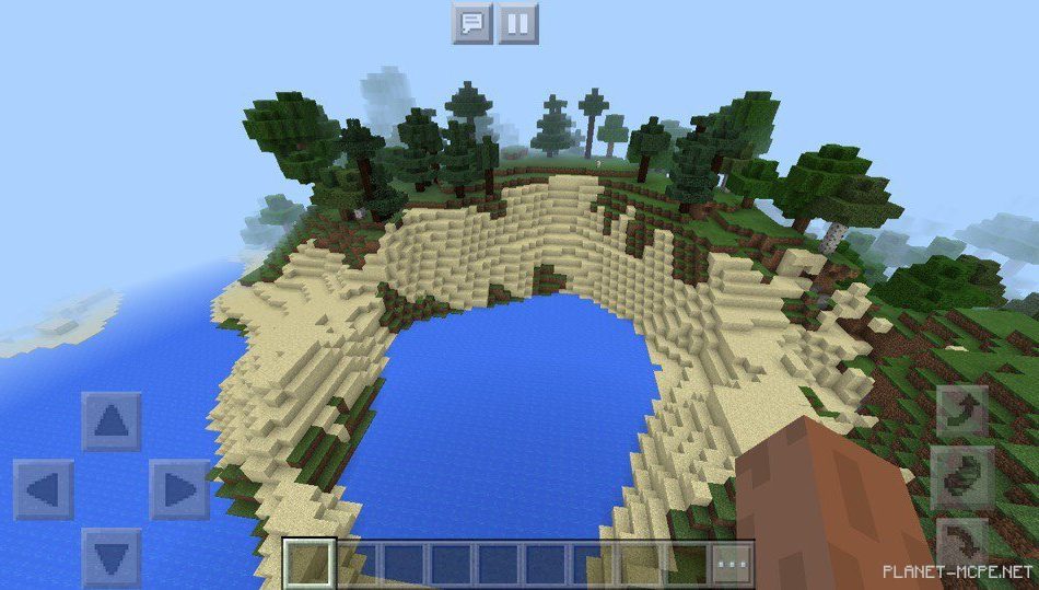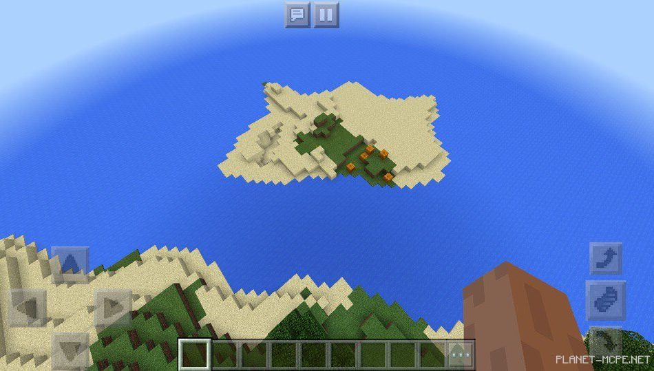 На этом сиде в Майнкрафт Покет Эдишн вы сможете увидеть необычной формы остров, расположенный в океане в Майнкрафт ПЕ 1.2. На этом острове растут тыквы, которые можно собрать на площадке МКПЕ и сделать ферму, а также вкусный тыквенный пирог в Minecraft Pocket Edition.